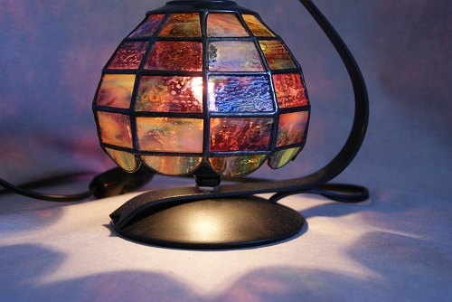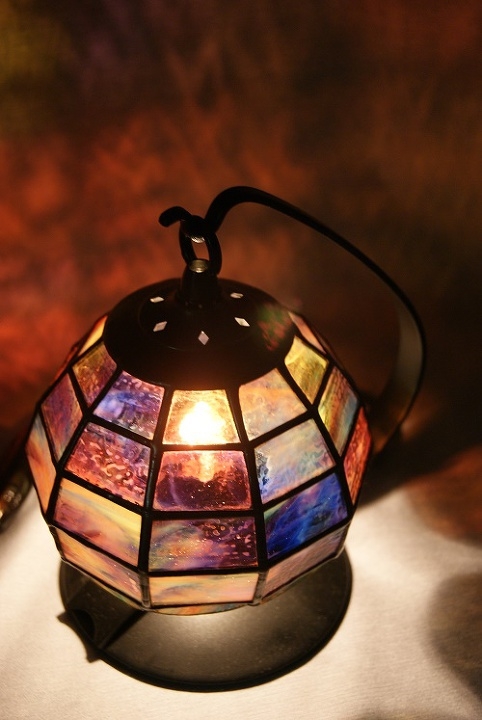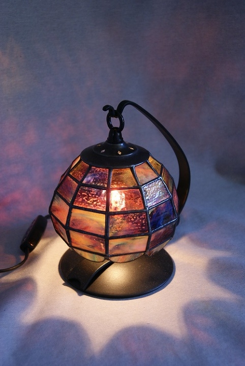 ピンク、赤、青、緑、黄、一枚のガラスで七色の光が…。横10面、縦5段に積み上げ、可愛いい風船のようなイメージで作りました。灯を入れて、ステンドグラスの世界を楽しんで頂き、いつまでも傍に置いて欲しいランプです。