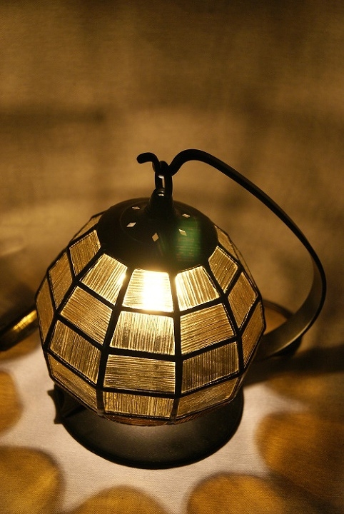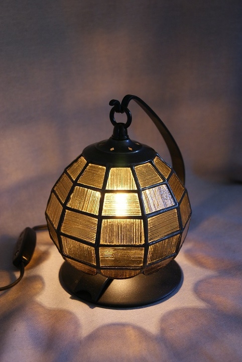 裏面に溝のあるアンバーの一枚のガラスで、横10面、縦5段に積み上げた可愛い風船のイメージランプです。アンバーの色は人気ですが、さらに溝を縦、横と交互にして光の屈折を楽しんでみました。灯を入れて、ステンドグラスの世界を楽しんで頂き、いつまでも傍に置いて欲しいランプです。