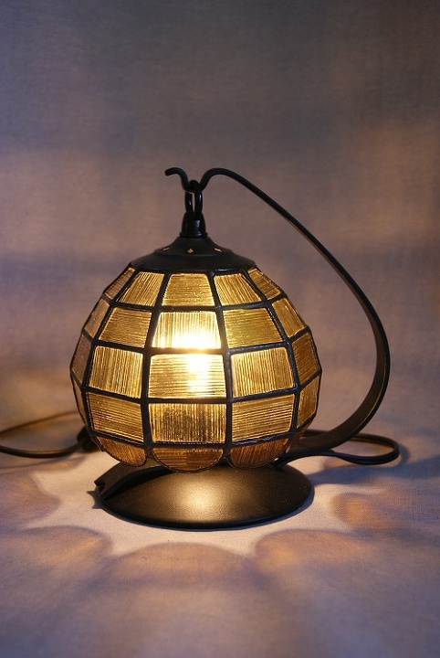 裏面に溝のあるアンバーの一枚のガラスで、横10面、縦5段に積み上げた可愛い風船のイメージランプです。アンバーの色は人気ですが、さらに溝を縦、横と交互にして光の屈折を楽しんでみました。灯を入れて、ステンドグラスの世界を楽しんで頂き、いつまでも傍に置いて欲しいランプです。