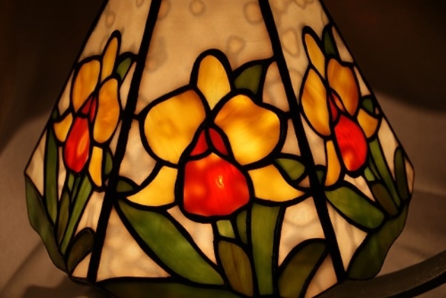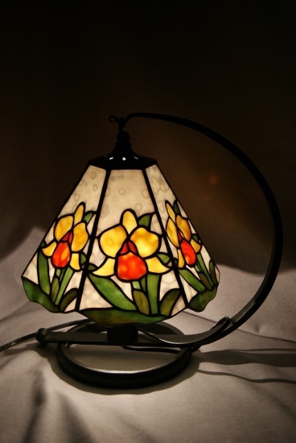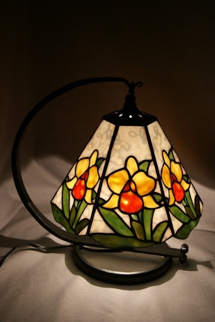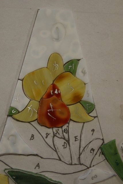 拘りのランプです。バックはリングモトル入りの白、カトレアにオレンジと黄色、