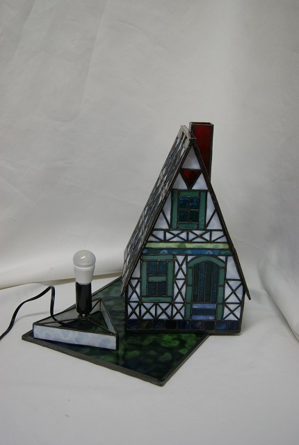 通常のハウスランプより壁や屋根に一手間かけて、より豪華なメルヘン調にしました。壁は白地にリングモトルの模様入りガラス。こだわりの屋根は、赤枠にグレー地のリングモトルのガラスに、ブルーの濃淡で風車をイメージした模様を入れました。屋根に重きを置いた為窓は少なくなりましたが、風車に合わせて2種の模様入りブルーガラスを使用。土台は茶系のマルチ色ガラスを細かなカットで、重厚感を出しました。土台に合わせた色合いの、ガラス台が付きます。
