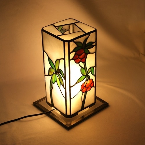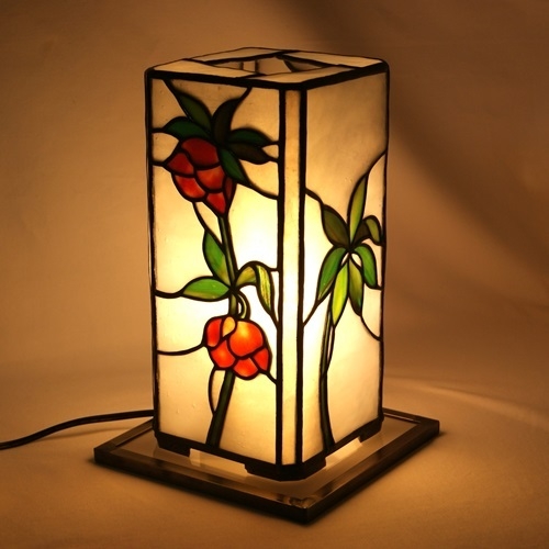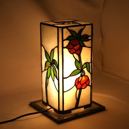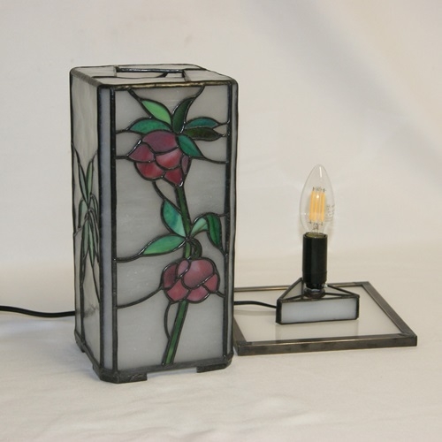 下向き加減に咲く愛らしいクリスマスローズ。和にも洋にもなるように、行燈仕立てにしました。くすみ加減のゴールドピンクのガラスが、クリスマスローズの雰囲気を出してくれました。葉は裏側に細かい溝を刻んだ赤みがかったグリーン。バックに氷のような雰囲気の乳白ガラスで、クリスマスローズを引き立てました。四角柱の角に細いラインを入れて、重厚な感じを出しました。