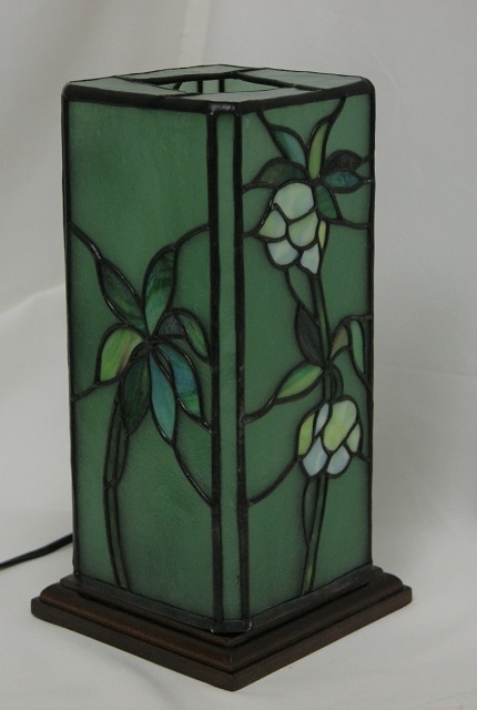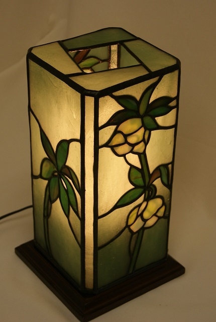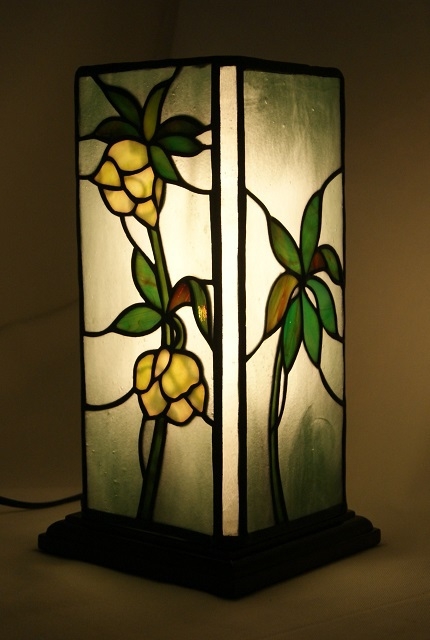 下向き加減に咲く愛らしいクリスマスローズ。和にも洋にもなるように、行燈仕立てにしました。白に薄い緑が入ったガラスが、白いクリスマスローズのやさしい雰囲気を出してくれました。葉は裏側に細かい溝を刻んだ赤みがかったグリーン。バックに氷のような雰囲気の淡いグリーンガラスが、花と一体化したような静かな癒やしの明かりを灯します。四角柱の角に細いラインを入れて、重厚な感じを出しました。
