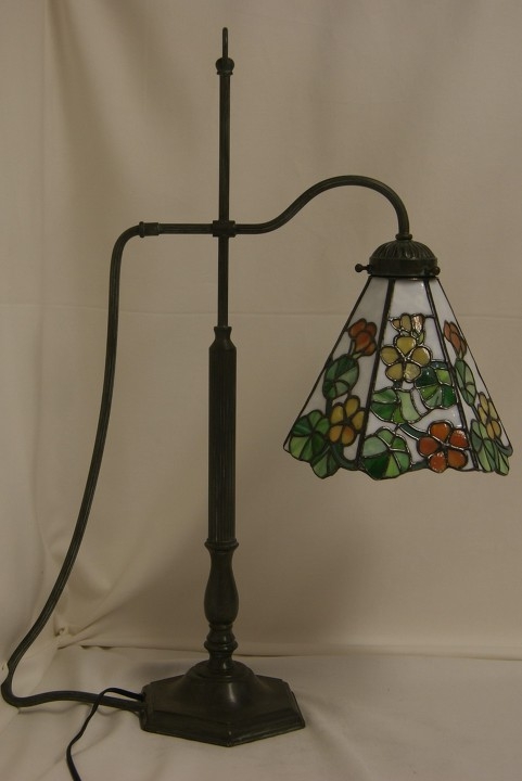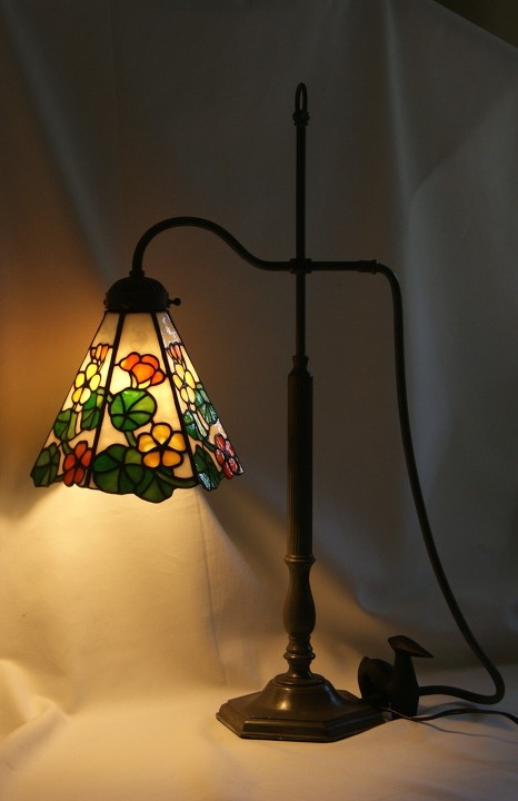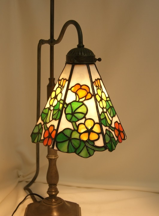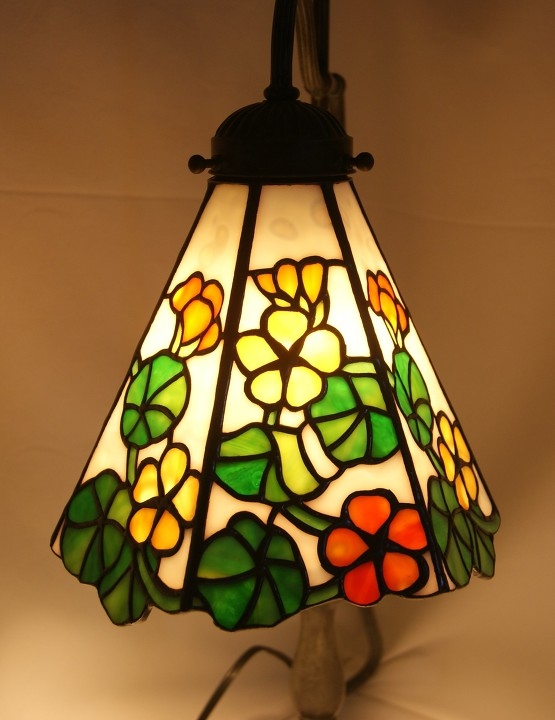 珍しい形のベースなので拘ったデザインをと思い、ナスタチュームの愛らしい花に決まりました。ベースを生かす為ランプの部分は大きくならないように小ぶりにしました。<br>一枚のガラスからオレンジと黄色を選び取り、花色が一体化するように気を付けた、手の込んだ細かいデザインです。バックはモトル入りの白、葉と茎が入って全体に優しい色合いとなりました。アンバランスなベースのせいか、普通に置いておく分には問題ないのですが、押したりぶつかったりした時倒れる事も考えて、反対側に万一の為の重り(鉄の置物)でバランスを取りました。この旨ご承知下さい。