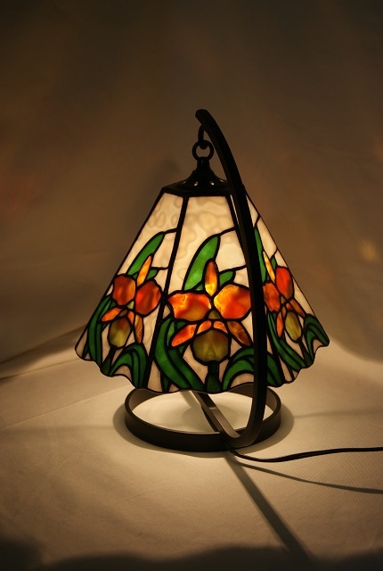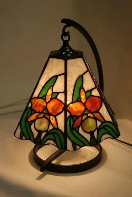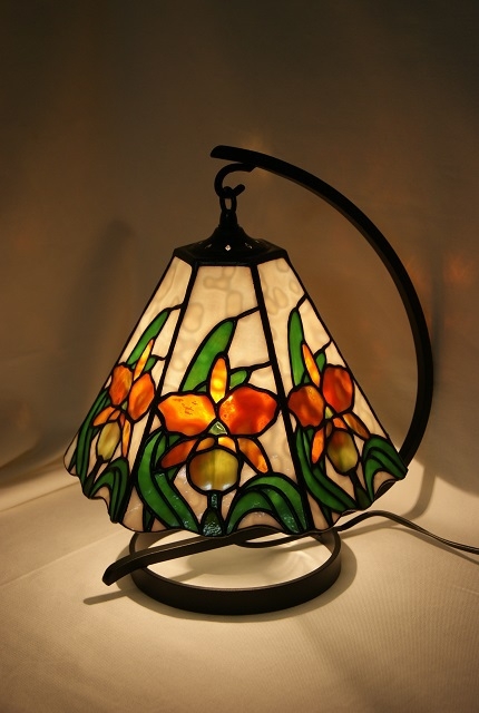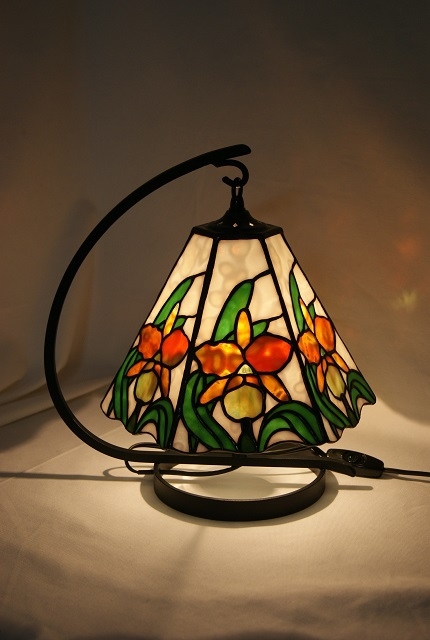 本物のカトレアに負けないように特にデザイン、ガラス選びに時間をかけました。花の部分は一枚のガラスから、微妙な雰囲気を出せるように取り分けました。バックは透明感の弱いモトル入り白、花はヤカゲニのオセアナガラス、葉は花に対比出来る様に、鮮やかな単色グリーン。華やかなカトレアランプをお楽しみ頂きたい、一品です。