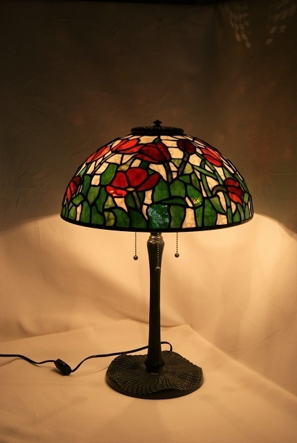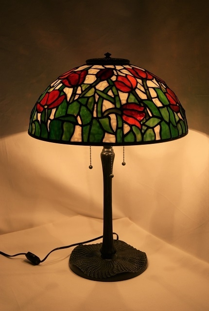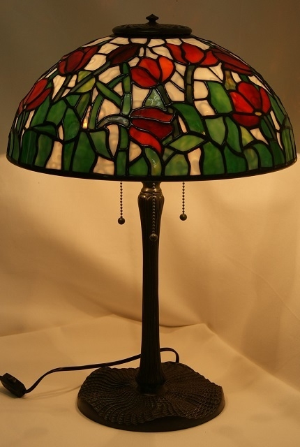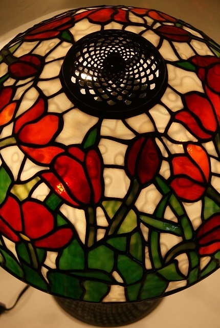 すべてウロボロス社のガラスを使用した、ティファニーランプレプリカの14インチ・チューリップです。花は1枚のガラスから赤〜オレンジの部分を取り分けて、微妙な色の変化を出しました。葉は2種類の緑色ガラス。バックはリングモトル入りの白。ティファニーランプには欠かせないウロボロス社のガラスでしたが、入手困難となってしまいました。在庫と時々入手出来るガラスを駆使してのティファニーランプです。赤〜オレンジの鮮やかな深い味わいを、お楽しみ頂きたい最高級ガラスのチューリップランプです。ベース(スタンド)は、しっかりした重さと仕上げの重厚な物です。
