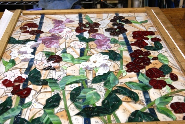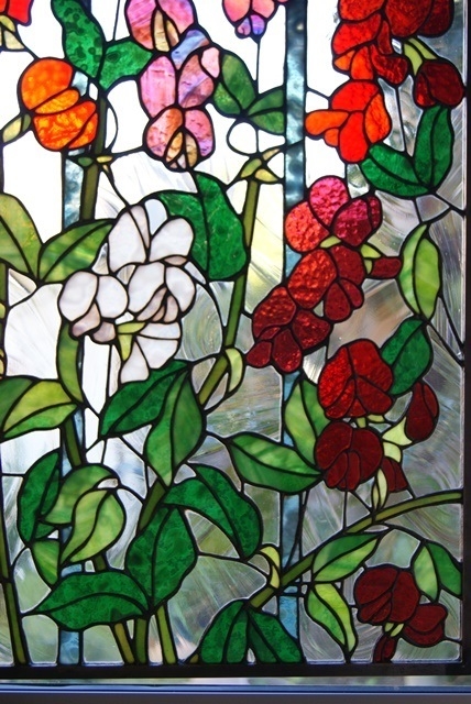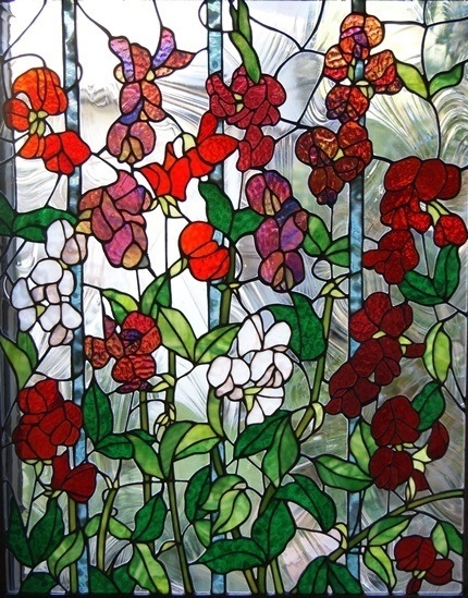 スィートピーの持つ可憐で華やかな雰囲気を表現する為、なるべく自然な動きが出るようにデザインに苦心しました。“花、葉、バックそれらのバランスをとる棒”とガラスを何度か切り直してやっと納得できるスィートピーが咲いてくれました。幸せを運んでくれますように・・・