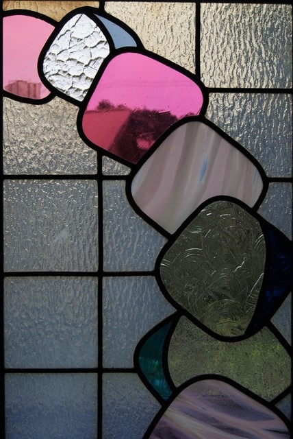 クリアーガラスだけでと思ったのですが、やはり色を入れたくなり、気持ちが明るくなるように、何度か色の入れ替えで出来上がりました。バックは乳白色ガラスの地紋入りで半不透明。