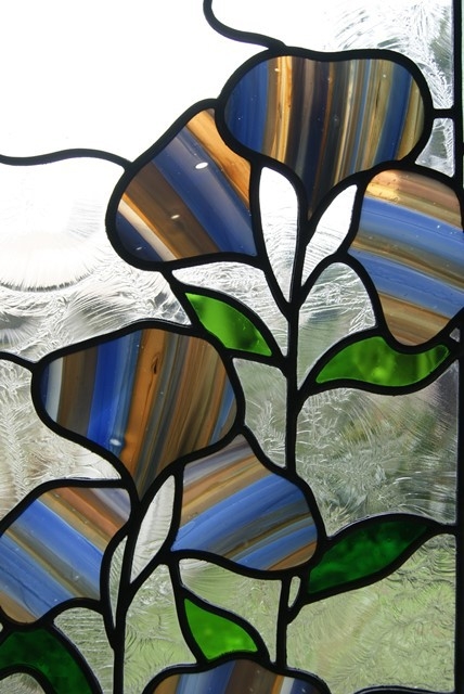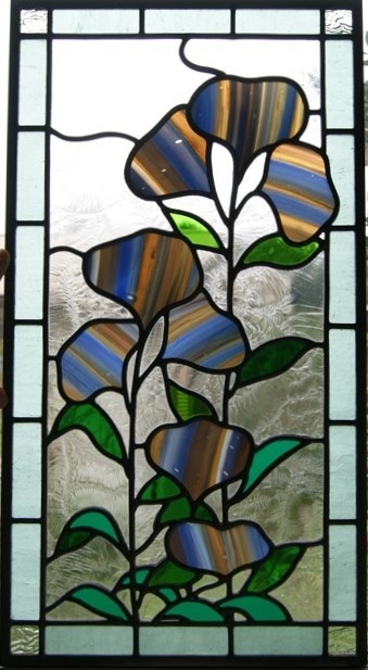夢で見た不思議な花が、心に残って即のデザインとなりました。アンティークガラスの持つ色の力を借りて、シンプルで神秘的なパネルに仕上がりました。バックのガラスは、クリアーに葉や波のように見える、刻み模様の半不透明(中が見えそうで見えない)ガラス使用。