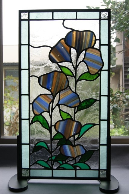 窓に組み入れなくても、鉄のパネル立てに入れて窓辺等に置いて楽しめます