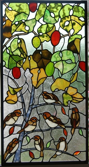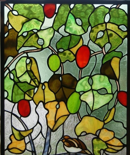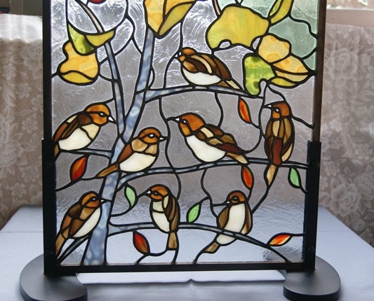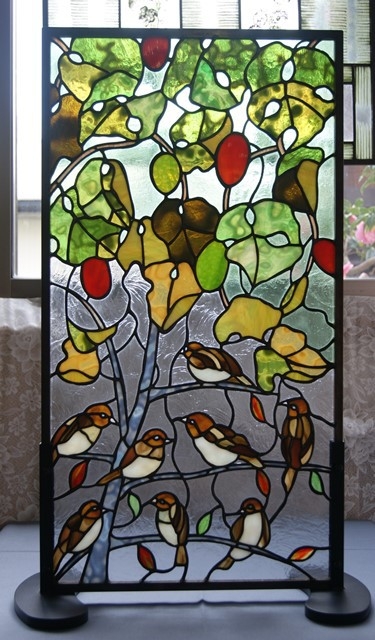 愛らしいスズメの姿に刺激され、表現するのに苦心しましたが、からす瓜に出会い物語が生まれました。枯れゆく葉の微妙な色合いと、熟れる実の鮮やかなオレンジ色、スズメの茶色、焦げ茶色、薄ベージュ色と、スズメらしい色合いは難しかったです。「スズメらの見つめる先にからす瓜」窓に組み入れたり、鎖を付けて窓に吊り下げたり、パネル立てに立てて、出窓やチェスト等に置いたりと様々な方法でお楽しみ頂けます。窓に掛けて楽しみたい方は、連絡を下さい。吊り下げられるように致します。立て掛けてご使用になる方の、鉄製パネル立ては、サービスでお付け致します。