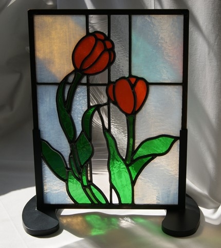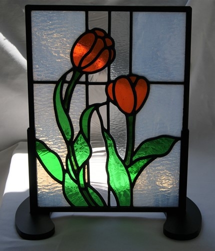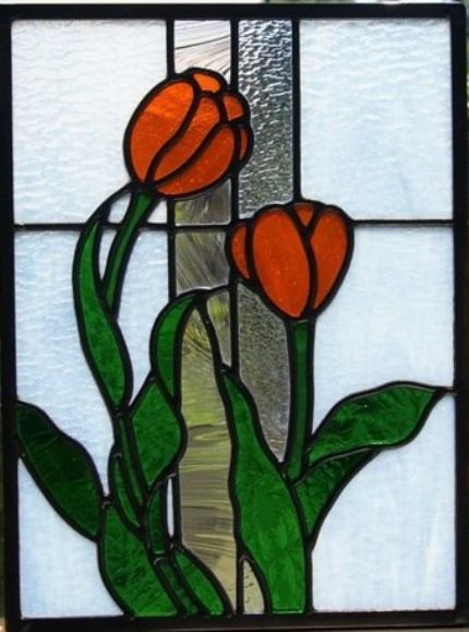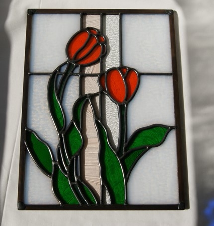 ステンドグラスが欲しい、でも「高くてなかなか買えない」、とステンドグラスを敬遠されてしまうお客様の為に、色違いでデザインは同じくすることで、お安く制作販売出来、ご愛顧頂いております。鉛線方式で格調の高いパネルです。バックガラスは乳白のグラニト。中央の2本のラインは模様入りのクリアガラス。花は透明の鮮やかなオレンジ色。葉は模様入りと無しの透明なグリン。周りは建物に入れられるように、真鍮のH鋼で制作しています。明り取りの窓やドアーや間仕切り窓等、様々な用途にお使い頂けます。