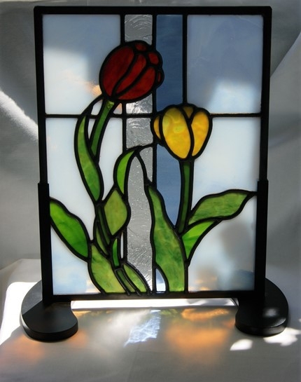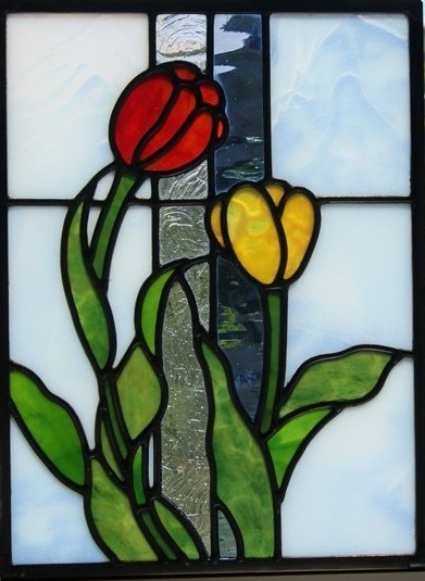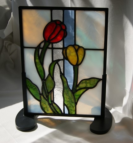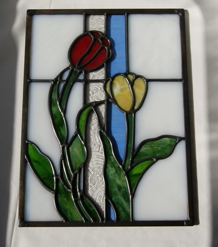 ステンドグラスが欲しい、でも「高くてなかなか買えない」、とステンドグラスを敬遠されてしまうお客様の為に、色違いでデザインは同じくすることで、お安く制作販売出来、ご愛顧頂いております。鉛線方式で格調の高いパネルです。透け感のある乳白のバックガラス。中央の2本のラインは、模様入りのクリアガラスと淡いブルーガラス。花は透け感のある赤と黄色。<br>葉は透け感のある2種のガラス。周りは建物に入れられるように、真鍮のH鋼で制作しています。明り取りの窓やドアーや間仕切り窓、等様々な用途にお使い頂けます。