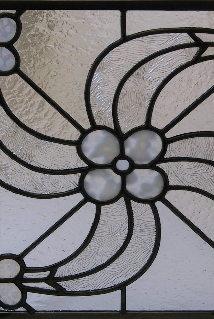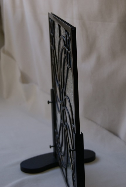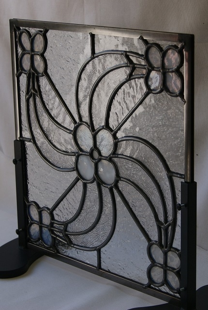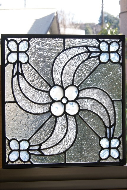 ヨーロッパの古い教会の写真に載っていたパネルが気になり、自分なりのデザインで起こしてみました。雰囲気は出せましたが、シンプルなようで組み込んでみると手間取るデザインと嘆かれました。色のないクリアーガラス(模様入り)と乳白ガラスのみ。鉛線だけで色合いのないパネルも又、よい物です。小さいサイズながら、重厚感のある飽きの来ないパネルです。