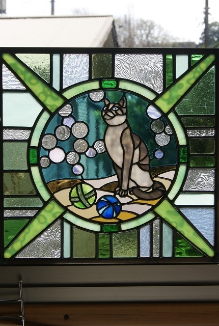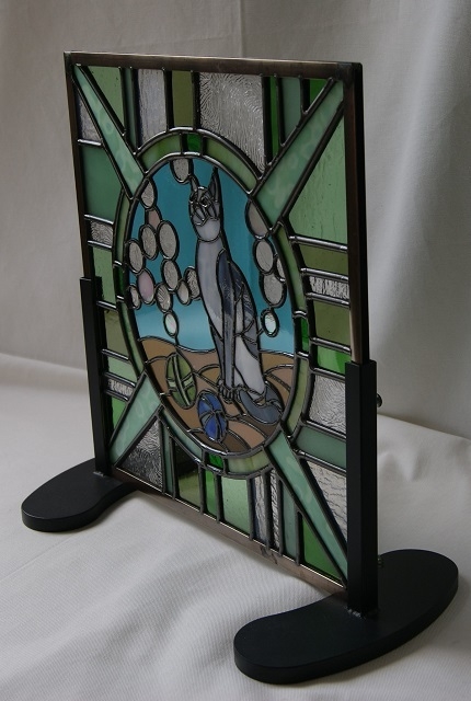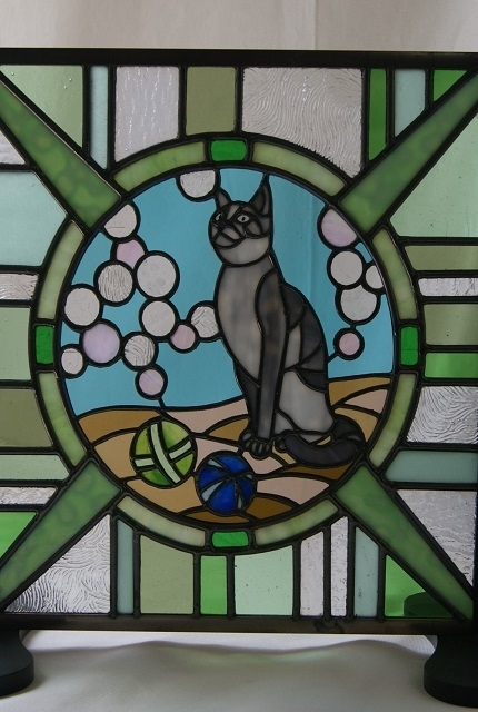 建物の窓、明かり取り、ドアー窓、に組み込み易いようにH鋼の真鍮で周囲は仕上げております。中心部の円形はコパー方式(銅のテープで硝子を包み半田で仕上げる)です。周りは鉛線方式。中心の猫の部分は抑えた色合いの中に、メルヘン的な雰囲気を出したく苦労をしました。特に猫の目の瞳が硝子で表現できず、最終的には耐久性のある絵付けで瞳を入れました。シャボン玉は色のない分、何種類ものクリアーガラスで変化を出しました。<br>足の部分、顔の部分は特に2~3ミリの硝子を駆使して表現した箇所もあります。パネル立てに立て掛け、チェスト等の台で楽しむことも出来ます。パネル立ては別売りです。