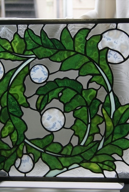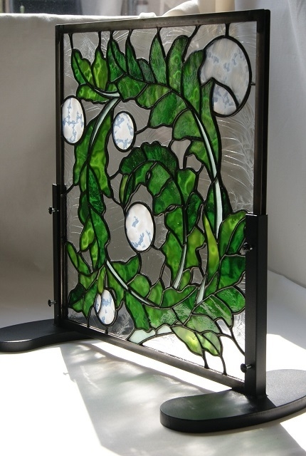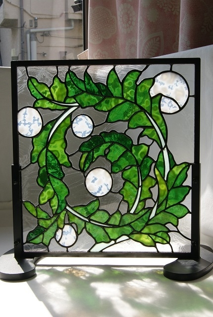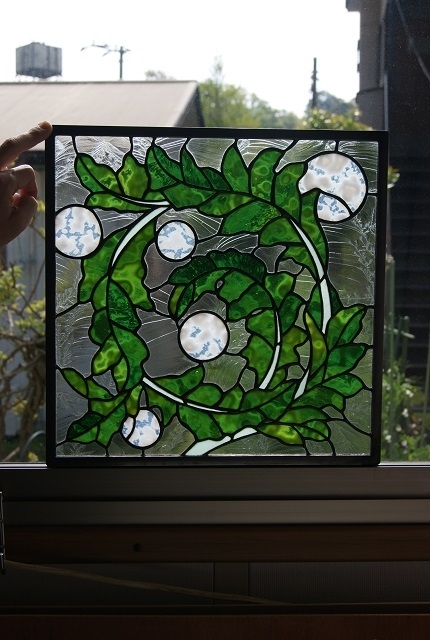 葉に丸をプラスしてピンク、緑、黄色、オレンジと色々差し替えてみたのですが、この白が一番何も語らずアカンサスを引き立ててくれました。一点だけしか創りたくないパネルです。表情のあるグリンのガラス(特別焼成)をコパー方式で仕上げました。お勧めとしてはドアー窓、間仕切り窓などの室内が良いかと思います。パネル立てに立てて、出窓にも合いそうです。
