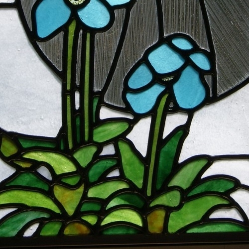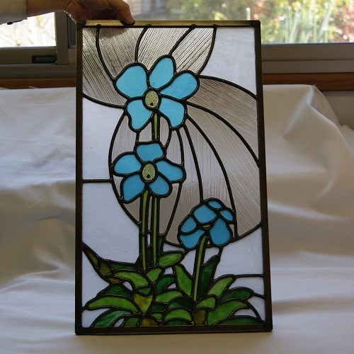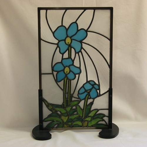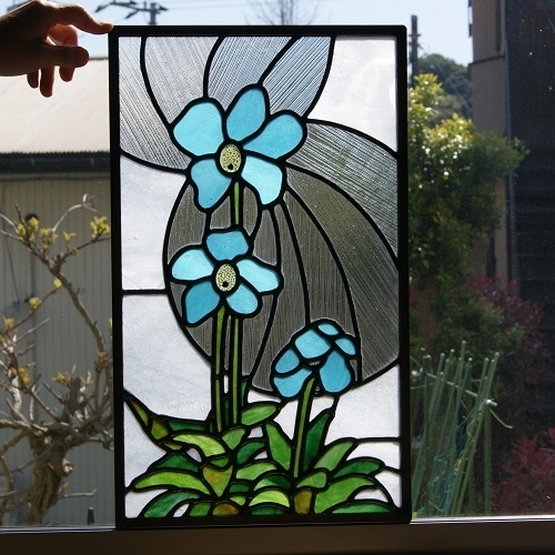 花は氷のようなガラスの水色、葉は氷のようなガラスの数種類のグリーン、バックは氷のようなガラスのやや乳白、2つの大小の円が花の補助ラインを助けてくれました。