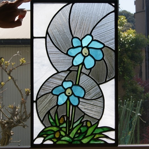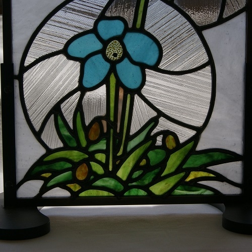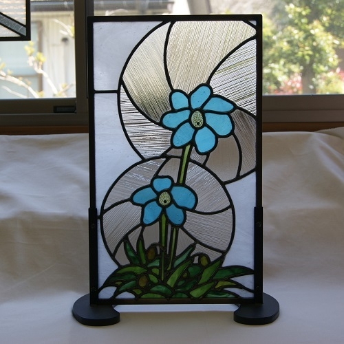 花は氷のようなガラスの水色、葉は氷のようなガラスの数種類のグリーン、バックは氷のようなガラスのやや乳白、2つの大小の円が花の補助ラインを助けてくれました。