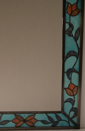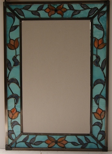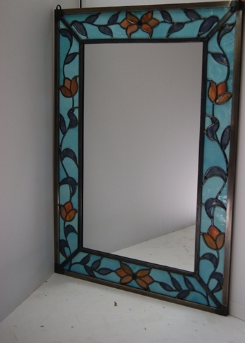 鮮やかなブルー地に合う様に、花の色選びに苦労しました。鏡の周りをステンドグラスで飾った、贅沢な1点物の鏡です。コパー仕上げ。サイズ H52cm、W36.7cm、D1cm、鎖付き